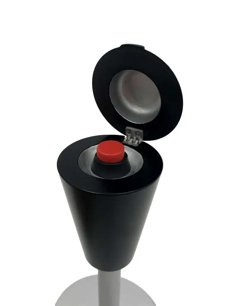 The knob is crafted of aluminum and resin. Its flip-up lid features a magnetic closure and the famous push button switch. Each replica is permanently mounted on a wooden display stand.