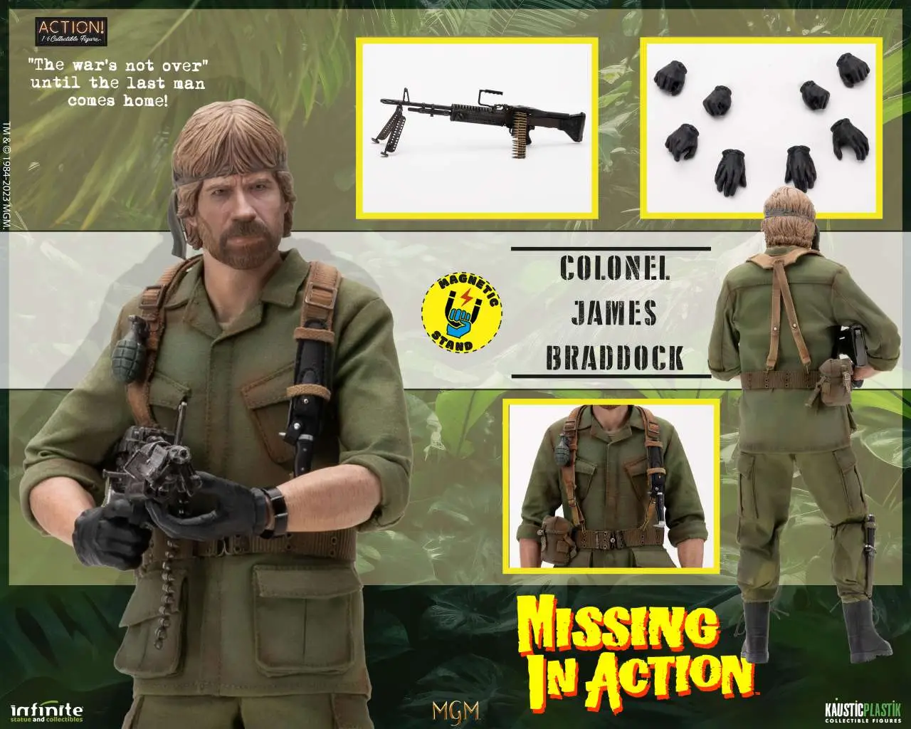 From Infinite Statue & Collectibles and Kaustic Plastik the action figure of Missing in Action Colonel James Braddock Standard Edition. Handcrafted and hand-painted with meticulous care and great details, this action figure is in 1/6 scale, with fabric clothes and includes accessories and interchangeable parts.