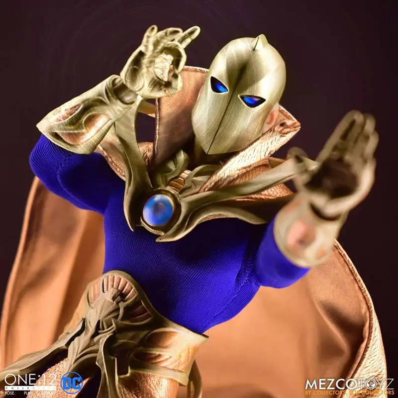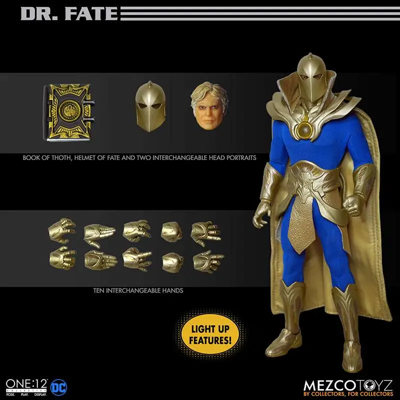 The One:12 Collective Dr. Fate wears a fitted bodysuit underneath his fortified light-up chest armor, a leather-like cape with integrated posing wire, a leather-like tasset, and knee-high boots. The Master of Magic comes complete with two head portraits including a Helmet of Fate portrait with light-up eyes and an unmasked Kent Nelson portrait. An additional Helmet of Fate is included that can be held.