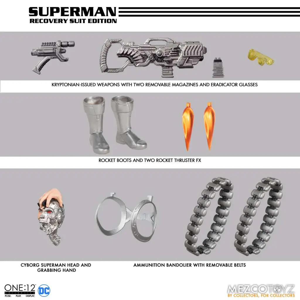 The Man of Steel is always prepared, wearing an ammunition bandolier with removable belts, and equipped with advanced Kryptonian weapons that can be held in his hands. The head of Cyborg Superman is included and can be held as well.