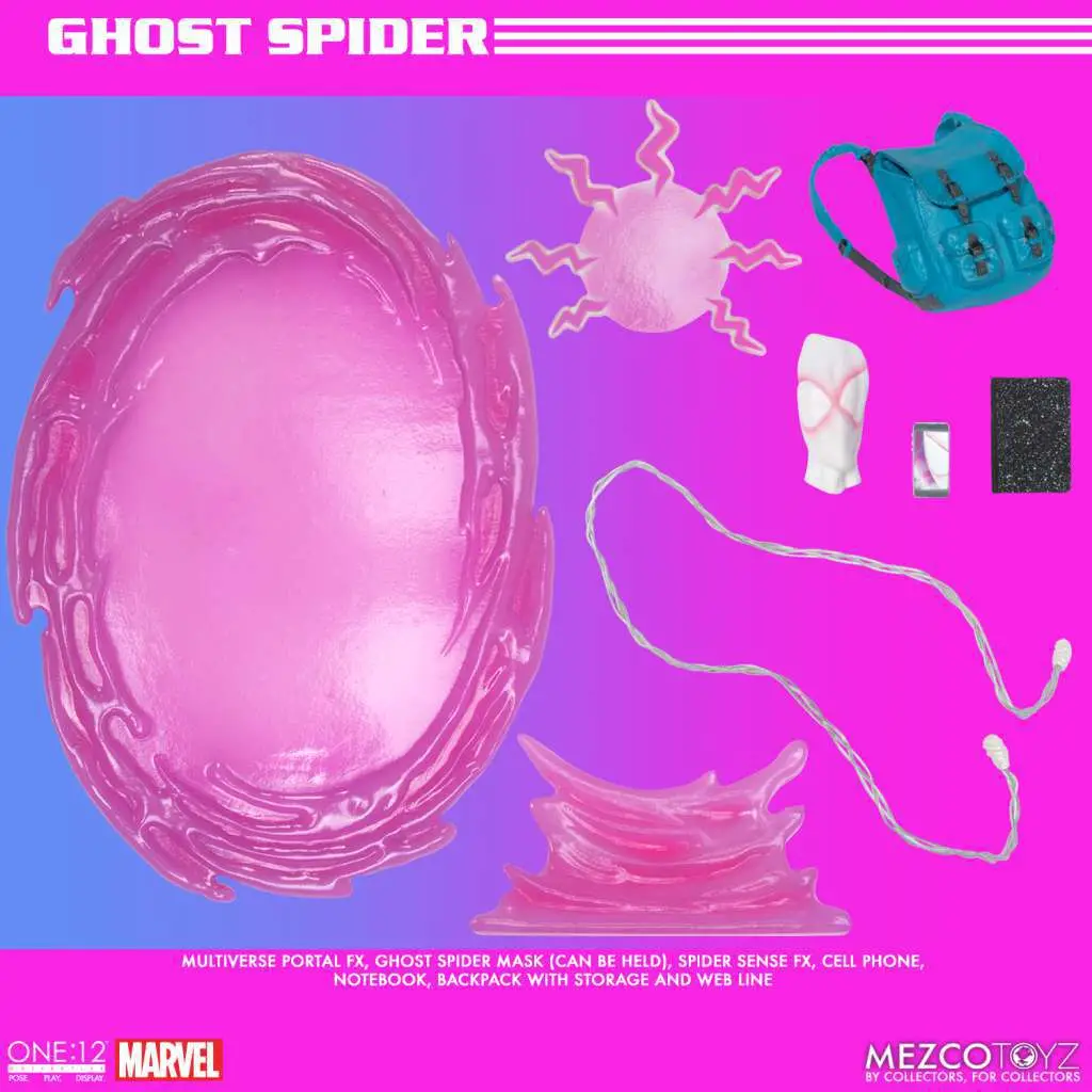 The One:12 Collective Ghost-Spider wears a fitted, hooded body suit with cobweb detailing. She comes complete with four head portraits with varying expressions, including an unmasked Gwen Stacy portrait.