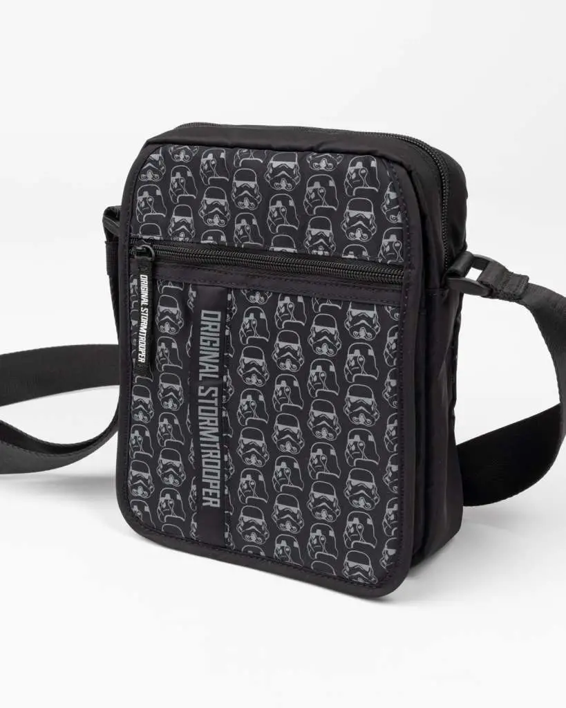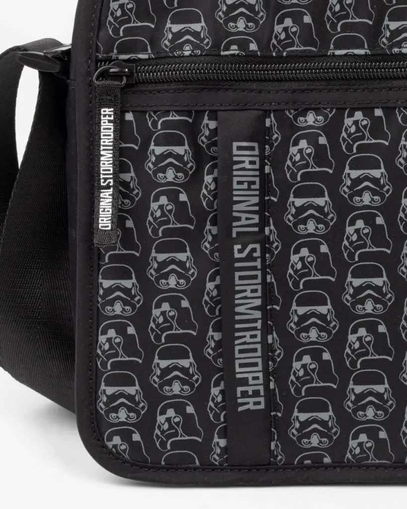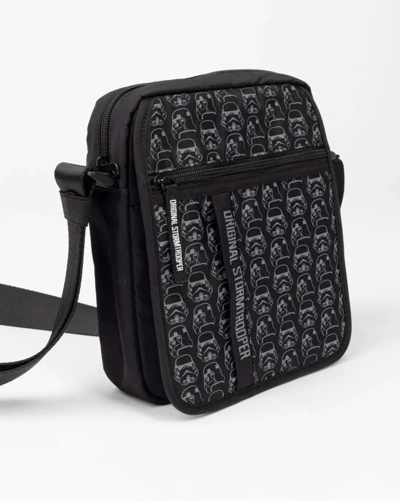 Expand your space with this stylish shoulder bag. This water-repellent black shoulder bag is 22cm long, 19cm wide and 5cm deep and features a subtle overall print of the famous Original Stormtrooper helmet in outline style.