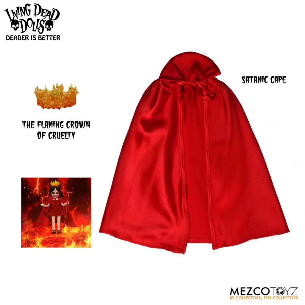 This little devil is possessed by two interchangeable "Death Mask" faceplates and two sets of chilling, glass-like eyes that shift from a sinister smirk to the Alternate Devourer of Souls form, each paired with different horns. Sin is outfitted in a red velveteen dress with "666" embroidered on her collar, ruffled socks, and T-strap Mary Jane shoes. Her devilish look is completed by a Satanic cape and the Flaming Crown of Cruelty.