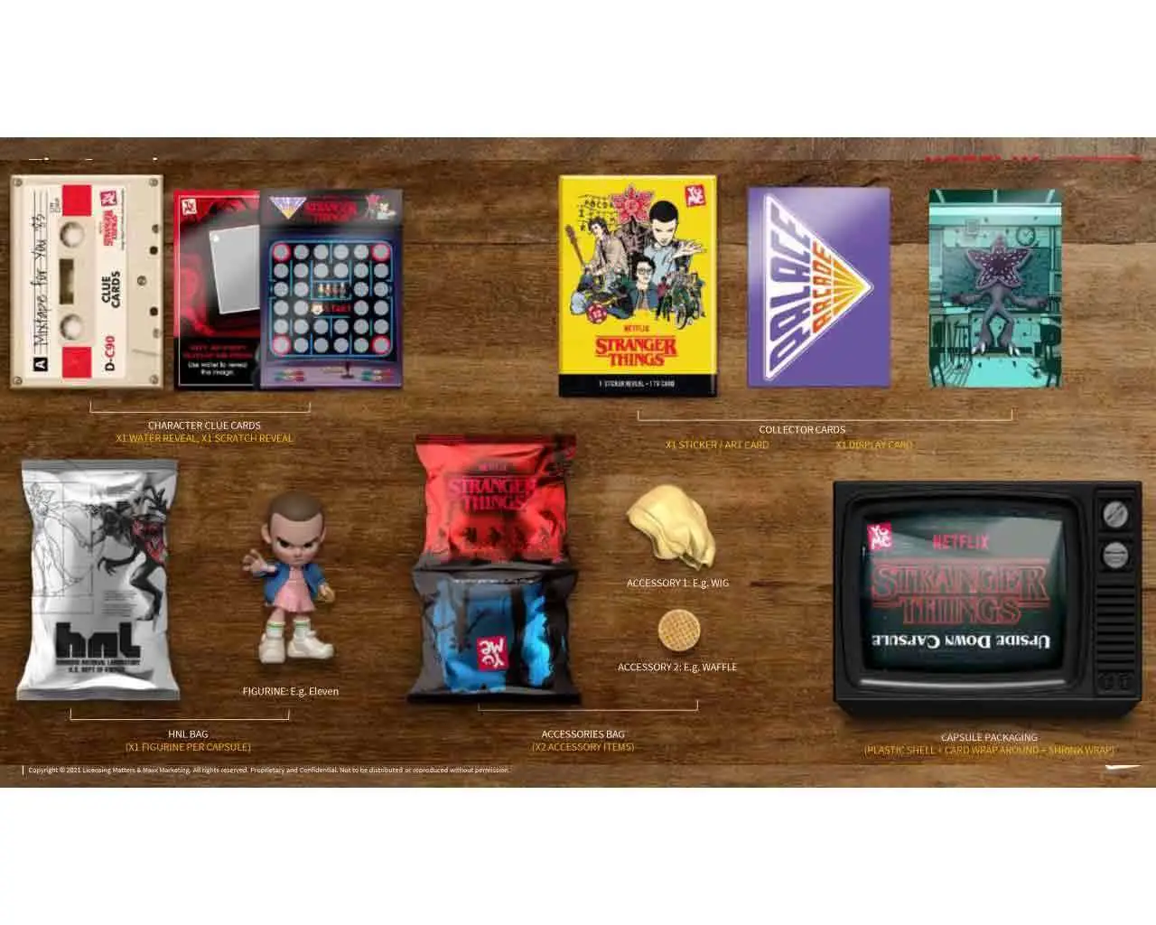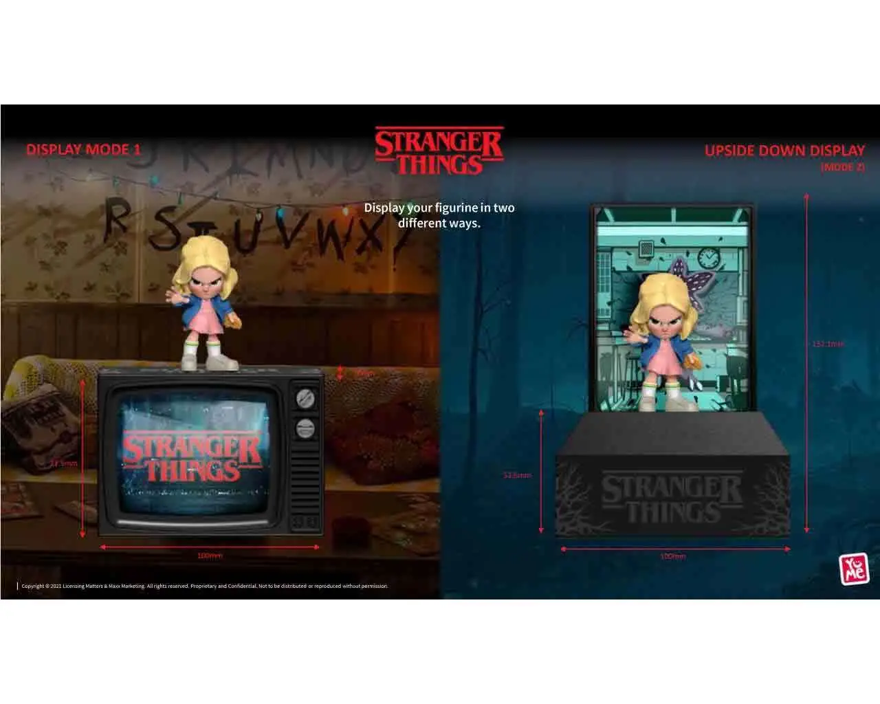 La Blind Box elle-même servira de présentoir pour le personnage, qui pourra être exposé de deux manières, soit sur un téléviseur avec le logo "STRANGER THINGS", soit en créant un mini diorama à l'aide de la Display Card.