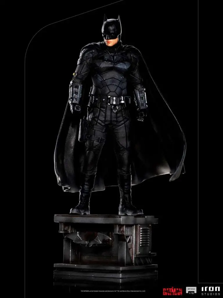 over the cold skyscrapers in the gloomy city of Gotham, the dark image of the Dark Knight watches the alleys, the most obscure corners, imposing fear in the hearts of the wicked on his crusade for justice and revenge. Facing the most insane criminals, corrupt public workers, and powerful mobsters, he makes use of his long training, his deductive skills, and his unshakable will to bring hope to the citizens of the city he has sworn to protect. Using a black tactical suit filled with gadgets reflecting the appearance of a big bat that represents his identity, Iron Studios proudly present the statue “The Batman - The Batman - Art Scale 1/10”, with the newest representation of the character in the movies, on a pedestal that reminds Gotham City’s concrete buildings with Batman’s symbol in the front.