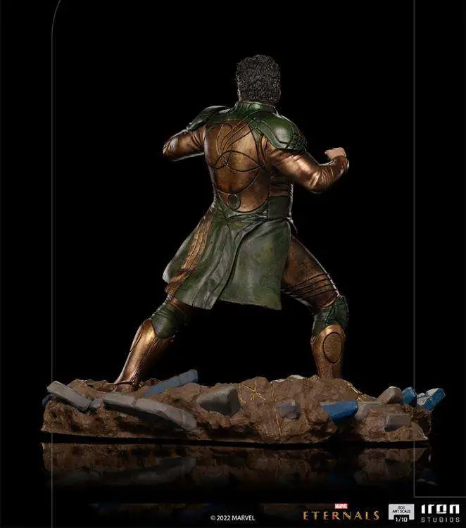 With his right fist closed and ready to deliver a powerful blow, the robust immortal warrior firms his feet between the rocks on his pedestal, staring at the enemy in his battleground. Capable of projecting golden exoskeletons enhanced with cosmic energy to protect his arms and fists, a power that increases his strength and durability, and wearing his green and golden celestial armor, Iron Studios present the Gilgamesh statue, with the strongest and kindest member of the Eternals community.