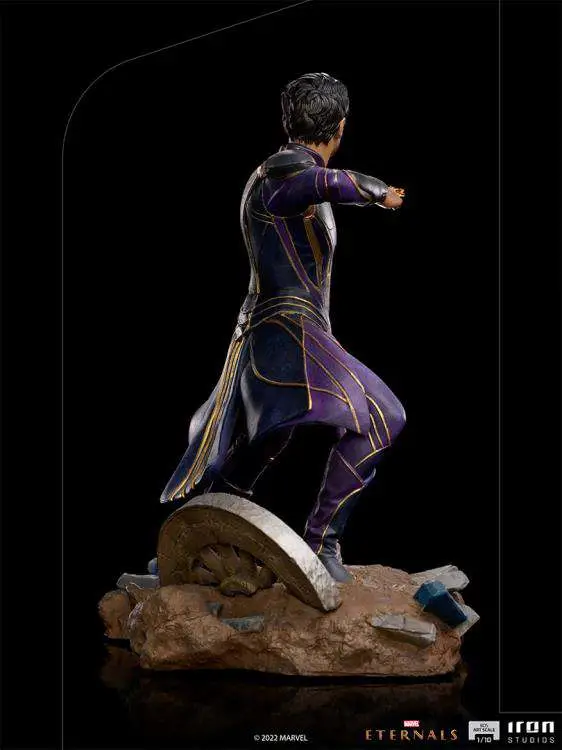 Confident and always prepared for action, he points his fingers ready to shoot spheres of cosmic energy. An extremely skillful combatant with millions of years of training and experience, he fell in love with the spotlights of fame, richness, and comfort, establishing himself in India, he becomes a famous star in the cinematic industry of Bollywood. To hide his immortality, he faked being the descendant of a single lineage of actors. With his purple celestial armor, Iron Studios bring the Kingo statue, with the actor, dancer, director, and superhero member of the Eternals in the fight against the Deviants.