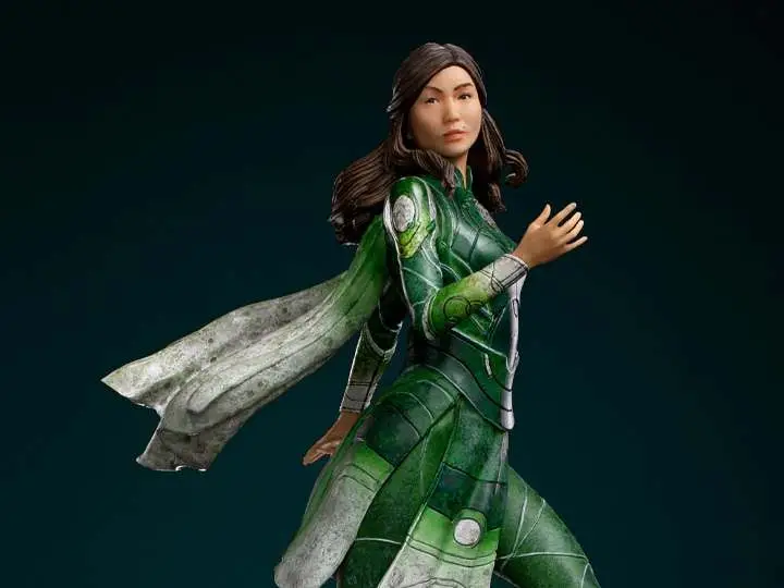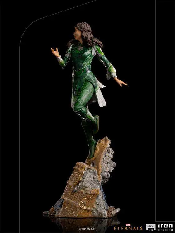 Gifted with the power of matter transmutation, capable of altering the composition of any material she touches, she even surprised all her Eternal companions when she transformed a Deviant monster into a tree because she should only be capable of transmuting non-sentient materials, indicating an even greater potential for her powers. With a positive personality, nice, but also discrete, she fell in love with her Eternal partner called Ikaris, with whom she married and stayed together for centuries, but conflicting ideals led them to go separate ways and her love for humans made her get closer and interact even further with beings from Earth. Equipped with her green celestial armor, jumping over a pedestal of ancient rocks, Iron Studios bring the Sersi statue, with the transmuter hero and defender of humanity from Eternals.