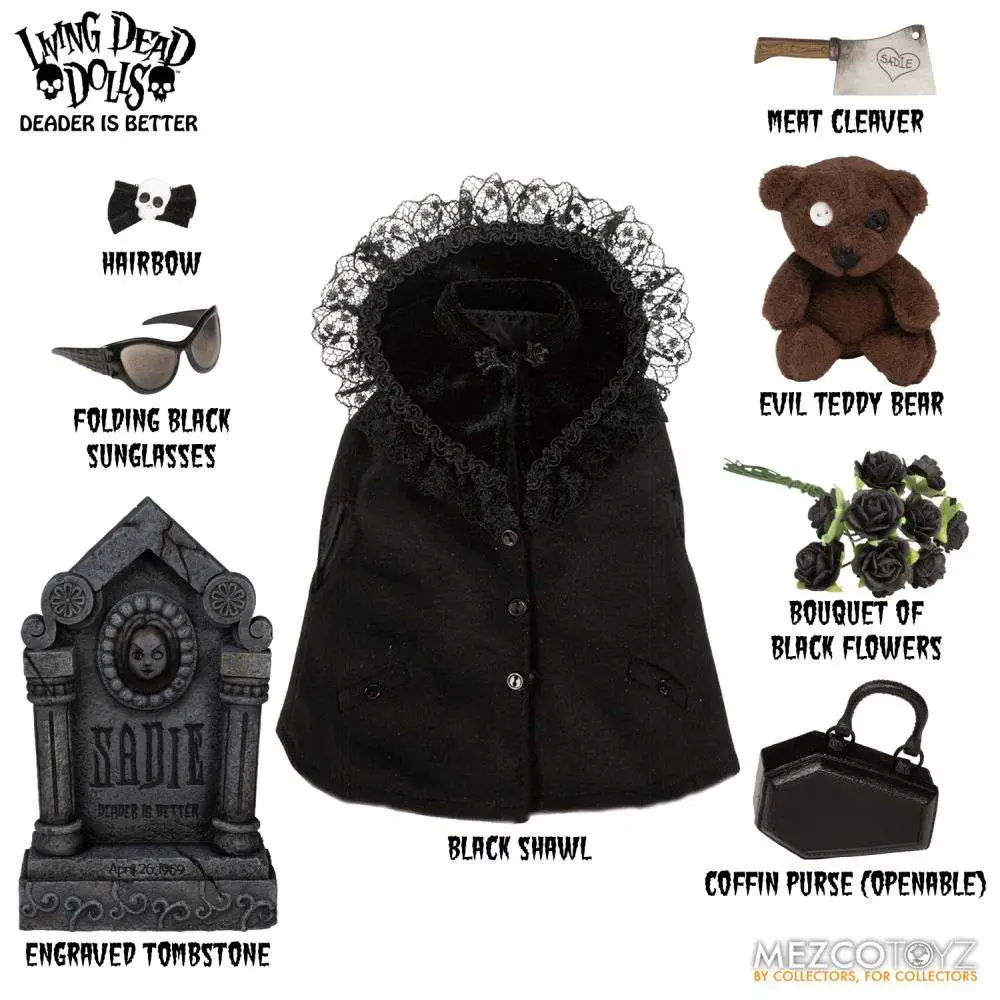 About Sadie: A-trinket a-trasket, Sadie’s escaped her casket! The “First Living Dead Doll” comes dressed in her iconic velveteen dress with satin collar and cuffs, Mary Jane shoes, and has a removable shawl and sunglasses for unfortunate daytime outings or to keep the night extra dark and gloomy. Switch between a grave glare or a sinister smirk with her interchangeable “Death Mask” face plates! Her evil eyes are glass-like and can move by way of controls inside her head.