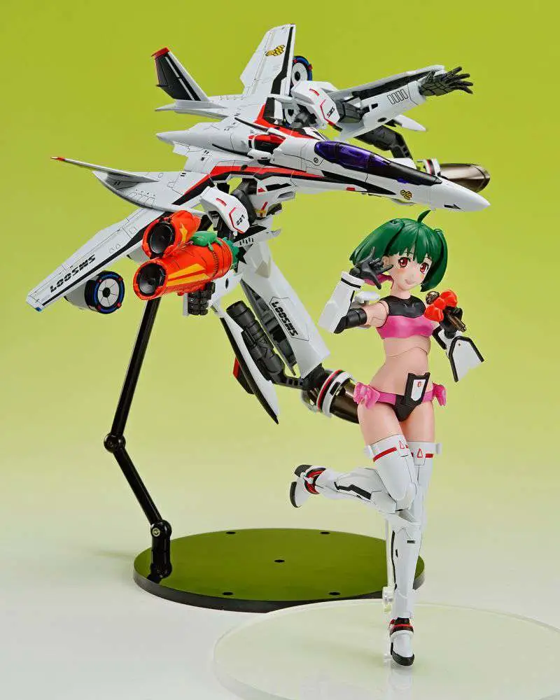 From "Macross F" series, the Super Dimension Cinderella "Ranka Lee" has become the first VF girl to appear in the series! The aircraft to be combined is the VF-25F Messiah, the livery of Alto Saotome's aircraft. A folded speaker is attached to the main wing of the aircraft, which can transform into three forms, and together with the speaker gun pod, it provides powerful support for Ranka's singing voice. Parts that can reproduce the image of the Dinam Chogokin costume, as well as accessory parts such as Ai-kun, Ranka’s cellphone, and microphone are also included. She also comes with parts for her bare feet and hands for the first time in the series, giving you even more ways to play with her!