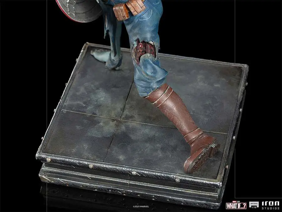 Dragging its left leg because of its fractured ankle, the decrepit creature, once the first avenger, walks forward on the metal floor of a train car, hungry and in search of its next prey. Although it’s roaring like a primal predator, what little fighting instinct is left in his memory from when he was still alive, plus the super-soldier serum that remains in his body makes him even more dangerous and lethal. Even as a zombie, the creature still knows how to use its legendary shield. In this way, Iron Studios presents its statue "Zombie Captain America - What If...? - Art Scale 1/10", derived from the Marvel Studios animated series from the Disney+ streaming.