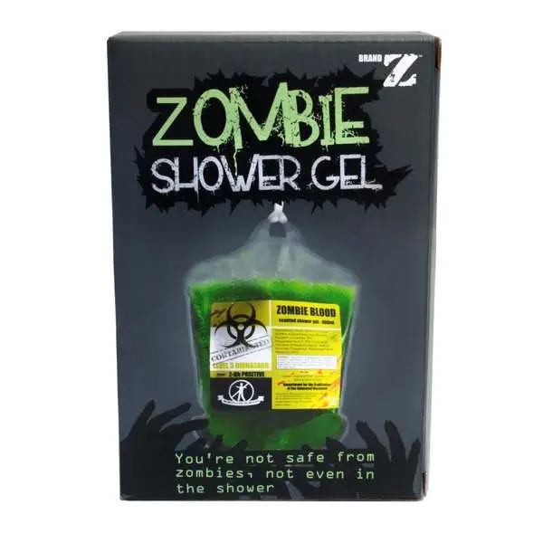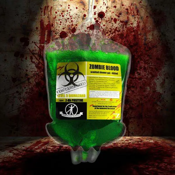 Zombie Shower Gel in blood pack shape. Marked with BioHazard symbols. Contains 400ml.