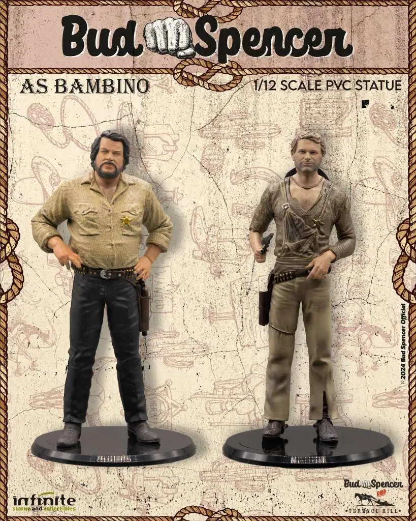 Dopo il grande successo delle statue in resina in scala 1/6, Infinite Statue & Collectibles è entusiasta di presentarvi la nuova collezione di mini statue in PVC in scala 1/12, dedicate ai leggendari Bud Spencer e Terence Hill! Rappresentati nei loro famosi ruoli di Bambino, Banana Joe, Bulldozer e Trinità, questi personaggi affascinano e divertono in una versione ancora più compatta. Ogni miniatura, ricca di dettagli e carattere, è perfetta per i collezionisti e gli amanti del cinema. Non perdere l’occasione di portare a casa un pezzo della storica amicizia che ha fatto ridere generazioni intere!