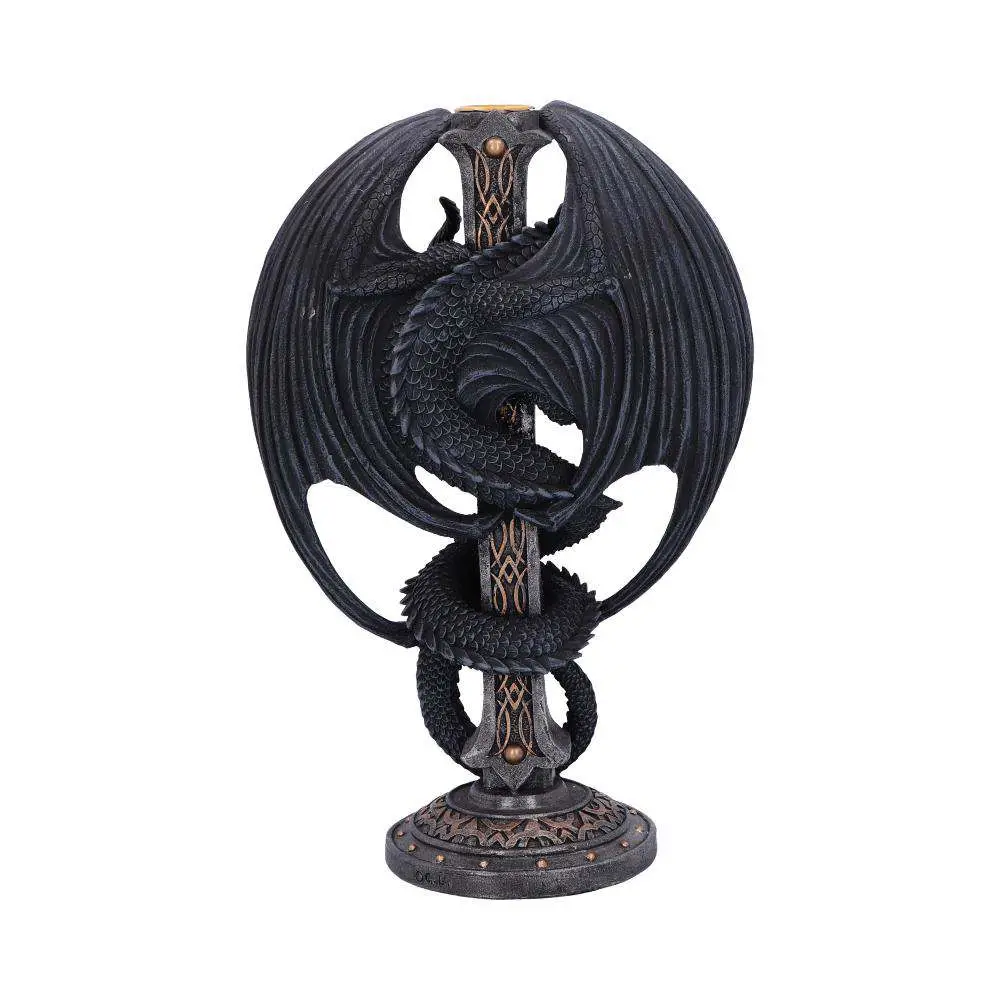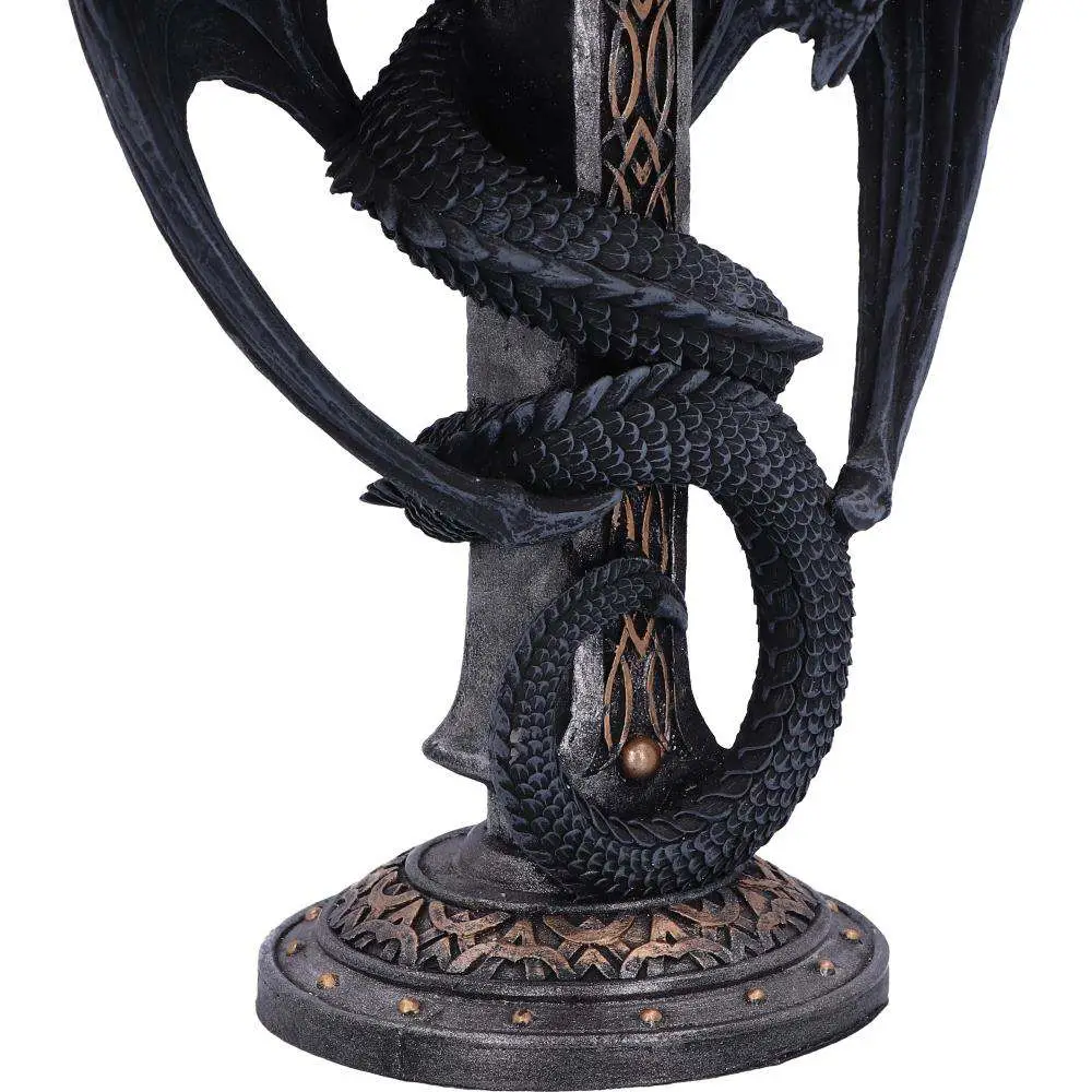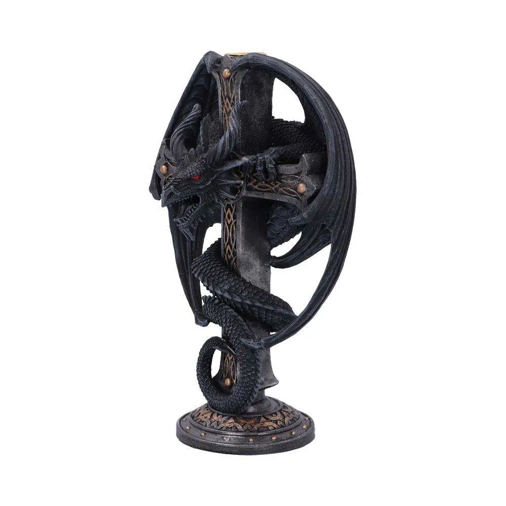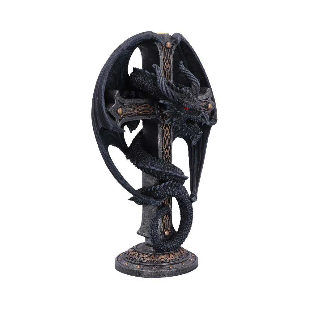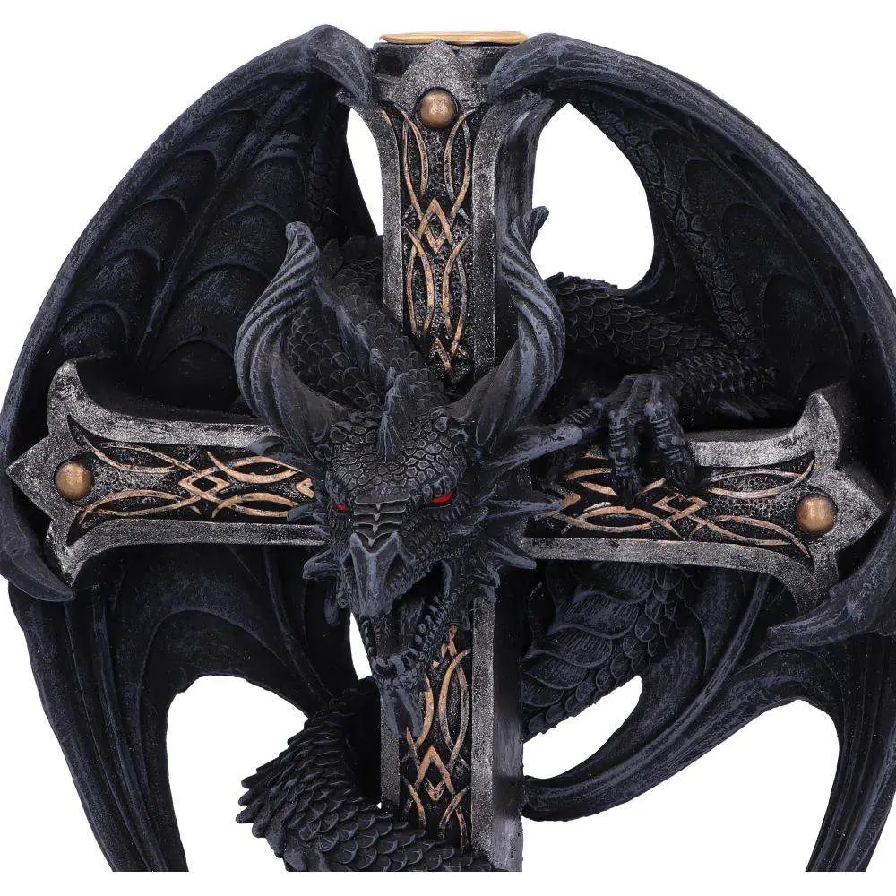 "Attorno a una croce con dettagli dorati, si avviluppa questo feroce drago dagli occhi rossi e penetranti. La sua coda a squame affilate è avvolta intorno alla parte inferiore della croce, mentre le grandi ali appuntite proteggono la parte posteriore. Un piccolo portacandela si trova in cima alla croce, perfetto per contenere una candela o un lumino aromatico ed aggiungere un'accogliente luce gotica a qualsiasi ambiente!