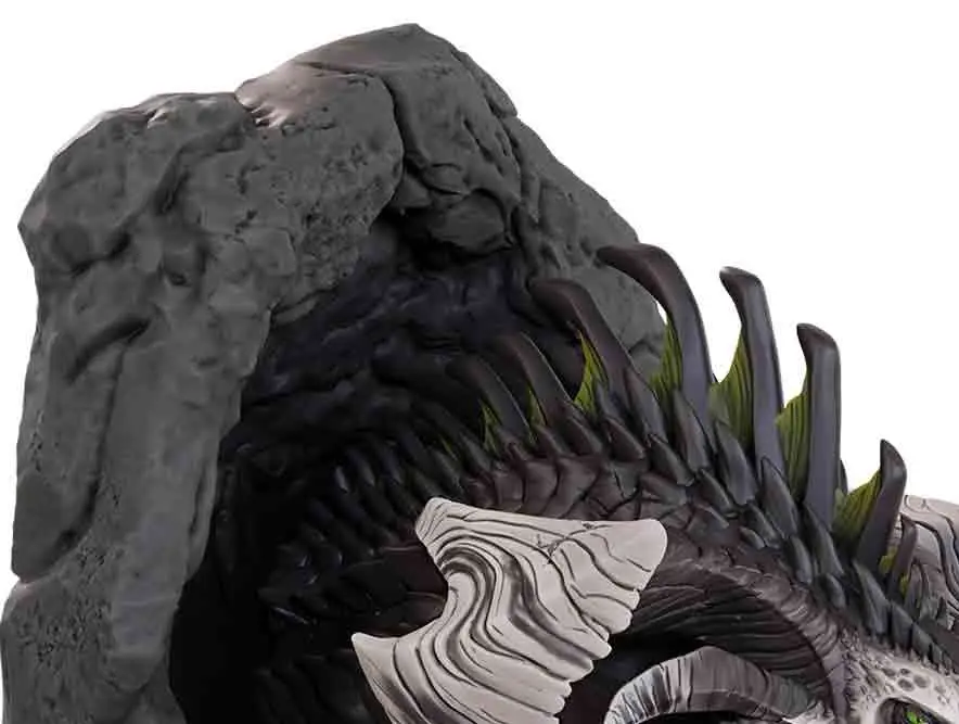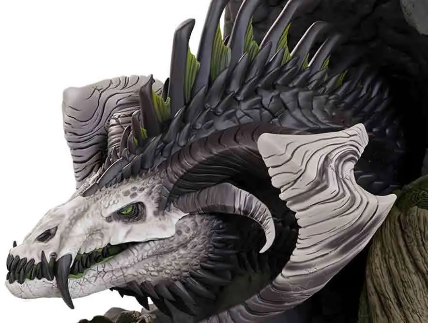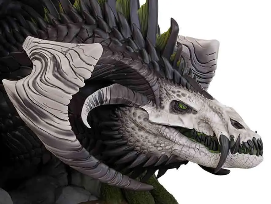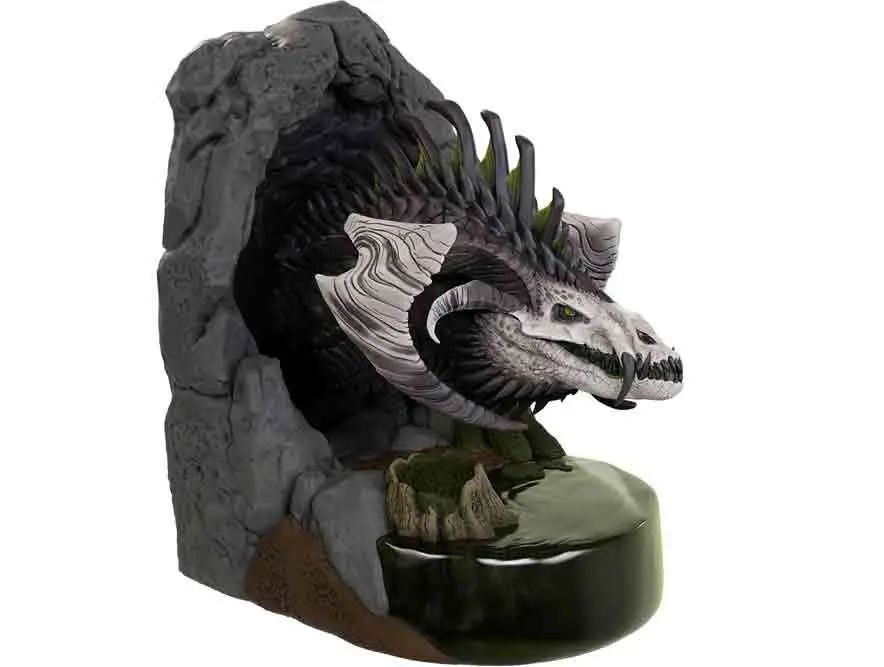 Questo fermalibri in resina alto 17,5 cm raffigura il Drago Nero dell'ultimo Manuale dei Mostri nel suo habitat preferito, una fetida palude.