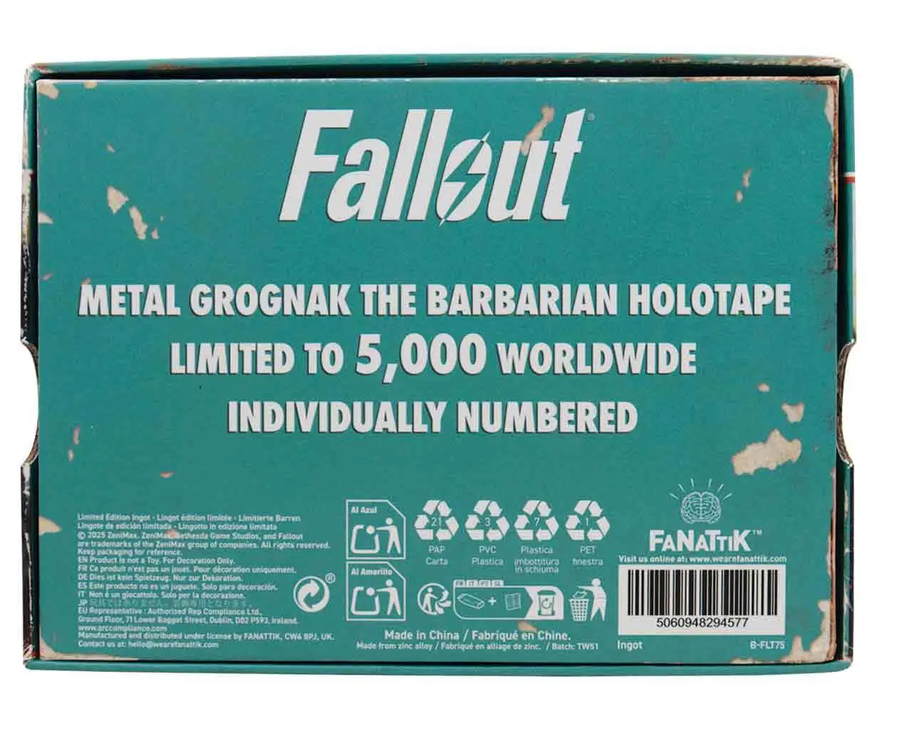 Direttamente dalle pagine dei fumetti prebellici di Grognak the Barbarian, quest' holotape da collezione in edizione limitata ti permette di brandire il potere dell’eroe definitivo armato di ascia… senza attirare un’orda di ghoul ferali. Ispirata al gioco di ruolo per il Pip-Boy approvato da Vault-Tec, Grognak and the Ruby Ruins, questa replica di Holotape presenta un design con rilievi marcati e dettagli su entrambi i lati, creata per i Vault Dweller che cercano sempre un pizzico di divertimento in più.