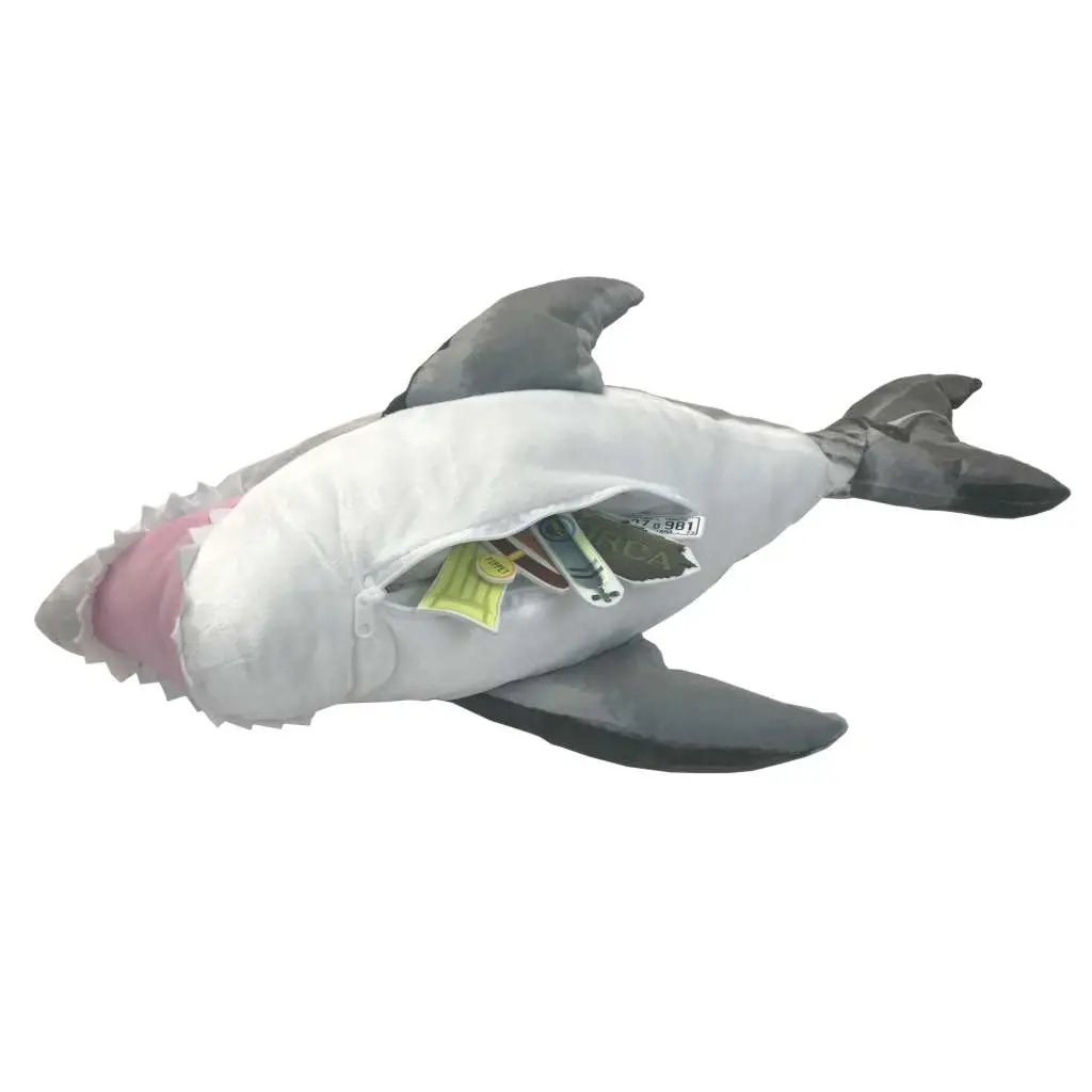 La vera novità rispetto alle precedenti simili proposte è data dalla zip sulla pancia...aprendola è possibile estrarre dallo stomaco della creatura gli iconici oggetti ingeriti, come visto nella pellicola...Troverete qundi delle riproduzioni stampate su feltro della bombola da sub, della tavola da surf morsicata, ed altre amenità