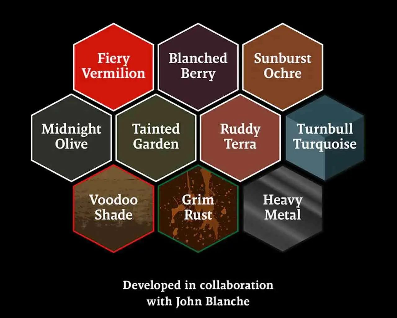 10 nuovi colori sviluppati personalmente con John Blanche per ispirare gli hobbisti a padroneggiare il suo iconico stile artistico gotico, bizzarro ma amato.