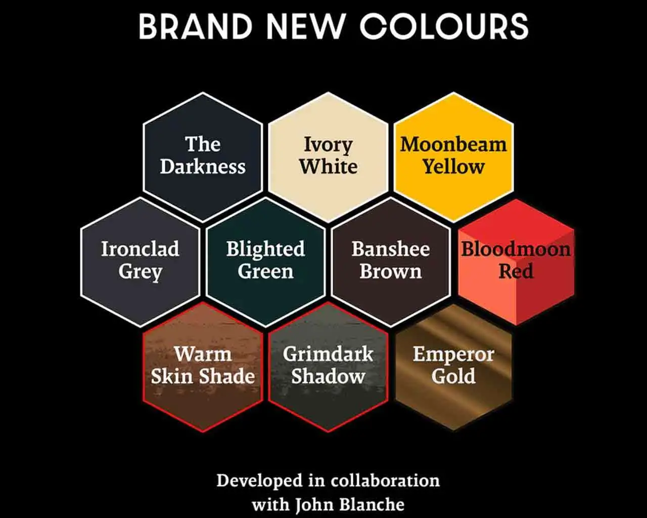10 nuovi colori sviluppati personalmente con John Blanche per ispirare gli hobbisti a padroneggiare il suo iconico stile artistico gotico, bizzarro ma amato.