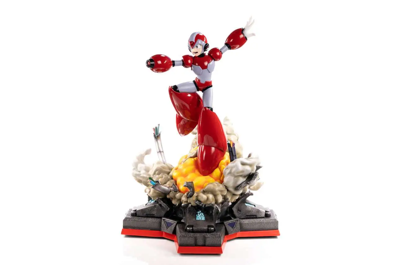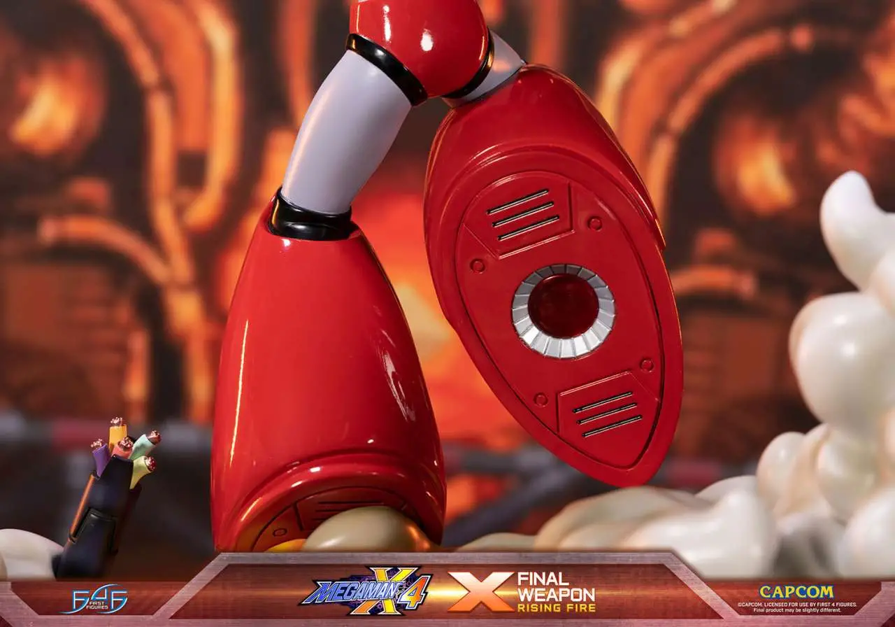 la statua immortala X in posa di attacco, con la sua armatura divenuta rossa, dopo avere ricevuto l’arma Rising fire da Magma Dragon. La statua include una intricata base display che riprende l’ultimo stage del gioco Megaman X4