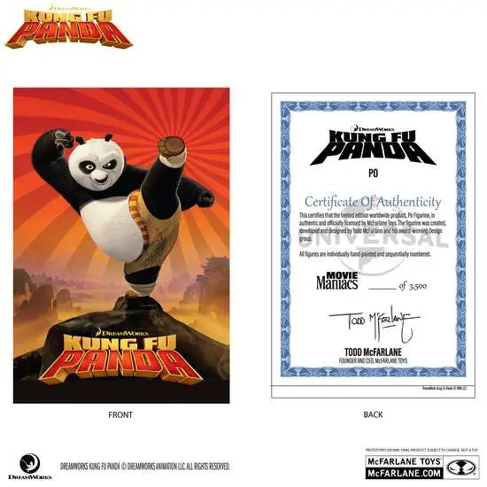 - Gli accessori di Po includono un fondale stampato, una base eD una scheda personaggio da collezione.
