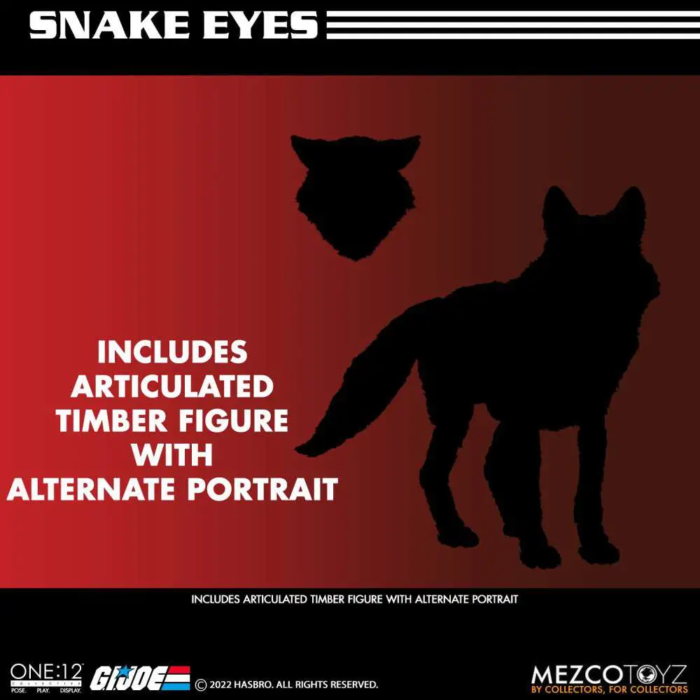 Direttamente da G.I. Joe ecco Snake Eyes! Questa bella action figure Deluxe per la serie One 12 Collective di Mezco è alta circa 15 cm, ha fantastici dettagli ed è arricchita da tantissimi accessori: mani intercambiabili, stand display, pistole, pugnali, spade, shuriken e addirittura il lupo Timber!