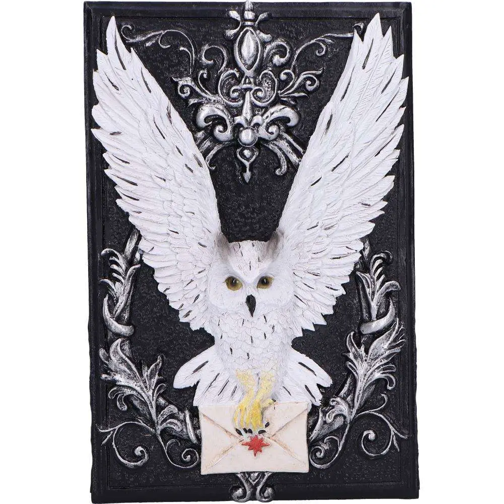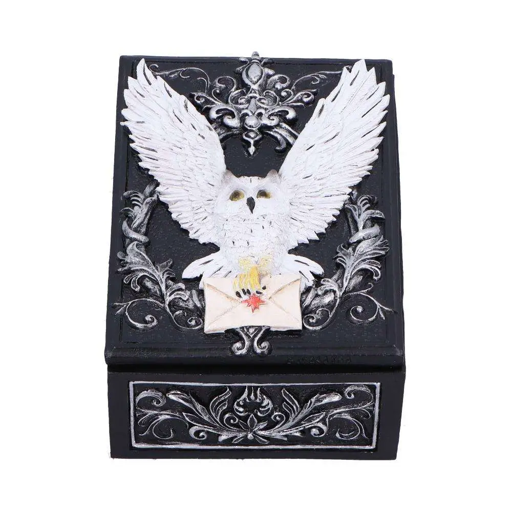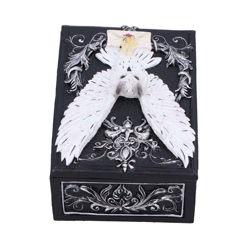 Al centro del design c'è una civetta bianca delle nevi splendidamente scolpita, che tiene delicatamente una lettera sigillata nel becco, evocando un'aura di magia e misticismo. Il gufo è appollaiato con grazia tra intricati motivi floreali gotici, rendendo questo pezzo un'aggiunta accattivante per gli amanti della fantasia e del mistico. Realizzata in resina di alta qualità e dipinta a mano con precisione, la scatola del messaggio con gufo non è solo visivamente incantevole ma anche altamente funzionale. Perfetto per conservare gioielli, tarocchi biscotti o piccoli tesori, garantisce che i tuoi oggetti siano tenuti al sicuro in un contenitore meravigliosamente unico. Sia che venga esposta come un pezzo accattivante o utilizzata per proteggere i tuoi ricordi preziosi, questa scatola aggiunge un senso di meraviglia e fascino a qualsiasi spazio. Accuratamente confezionato per garantire che arrivi in ​​perfette condizioni, il Gufo Messenger Box è un regalo ideale per collezionisti, appassionati di fantasy o chiunque sia incantato dal mistico e dal misterioso. La sua combinazione di praticità e design incantevole lo rende un complemento perfetto per qualsiasi casa o collezione, aggiungendo un tocco di eleganza e magia a qualsiasi stanza.