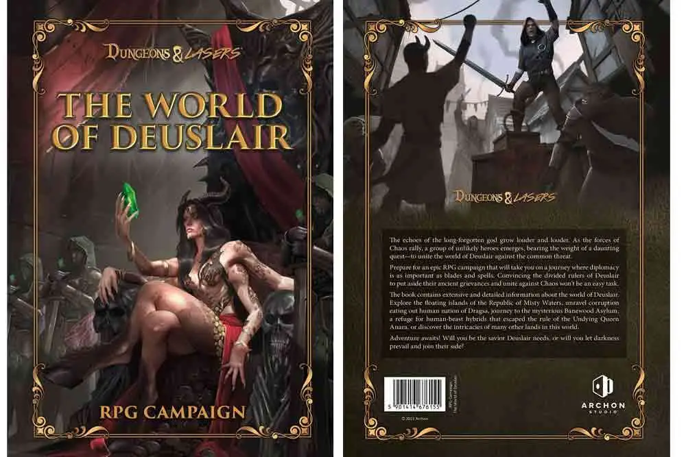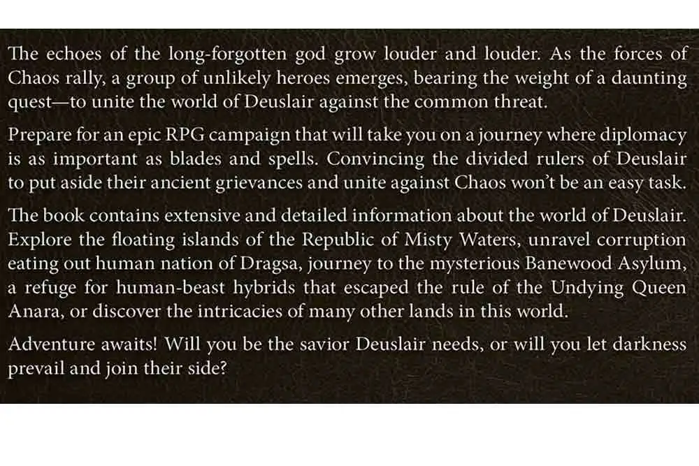 Il libro contiene informazioni ampie e dettagliate sul mondo di Deuslair. Esplorate le isole fluttuanti della Repubblica delle Acque Nebbiose, svelate la corruzione che divora la nazione umana di Dragsa, viaggiate verso il misterioso Ashylum di Banewood, un rifugio per gli ibridi umano-bestiali sfuggiti al controllo della regina Anara, o scoprite le complessità di molte altre terre di questo mondo. L'avventura vi aspetta! Sarete il salvatore di cui Deuslair ha bisogno o lascerete che le tenebre prevalgano e vi unirete al loro fianco? e vi unirete al loro fianco?
